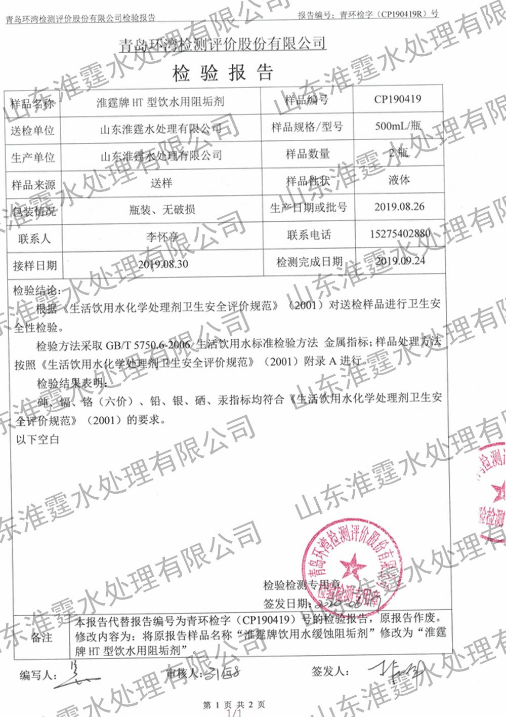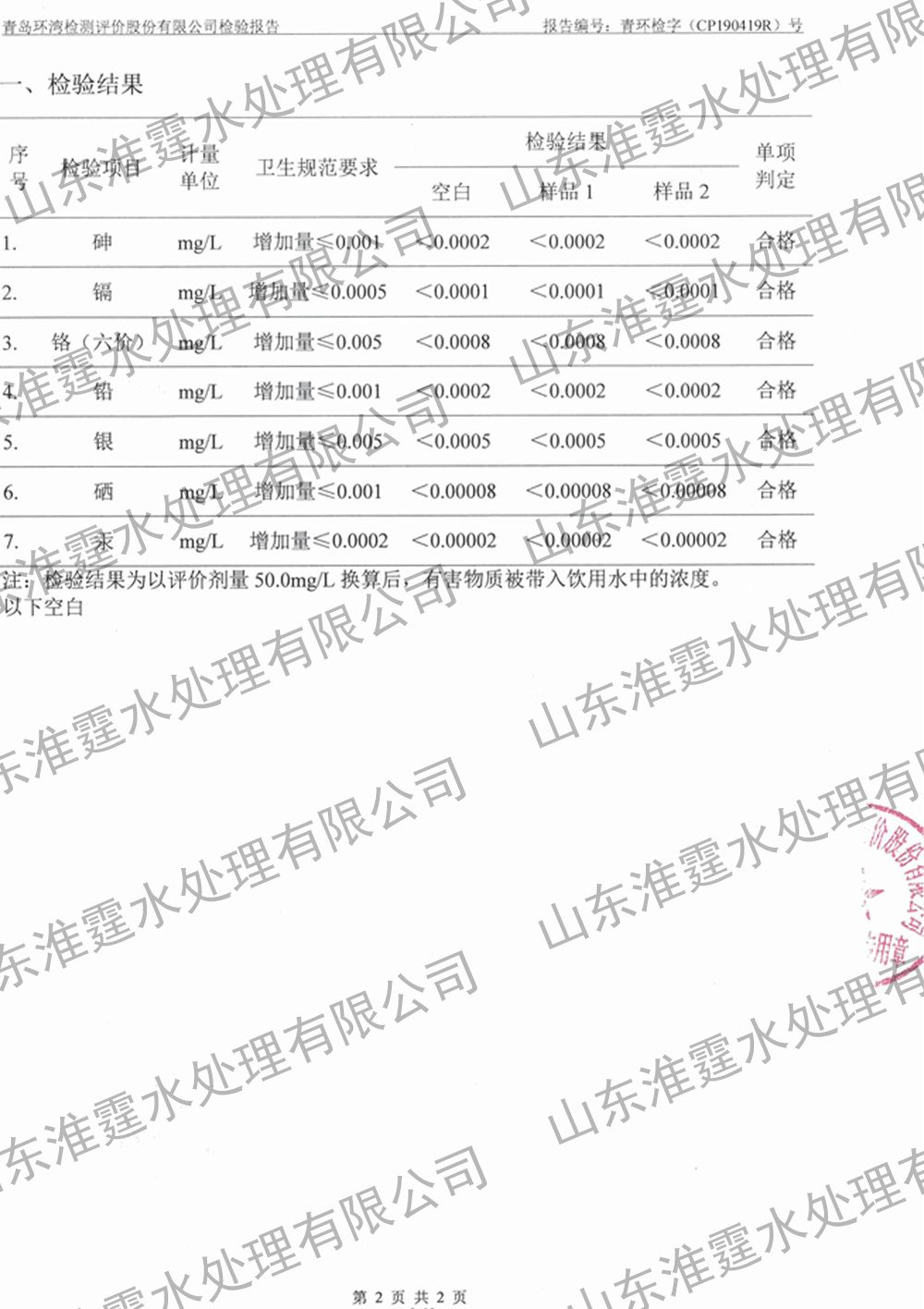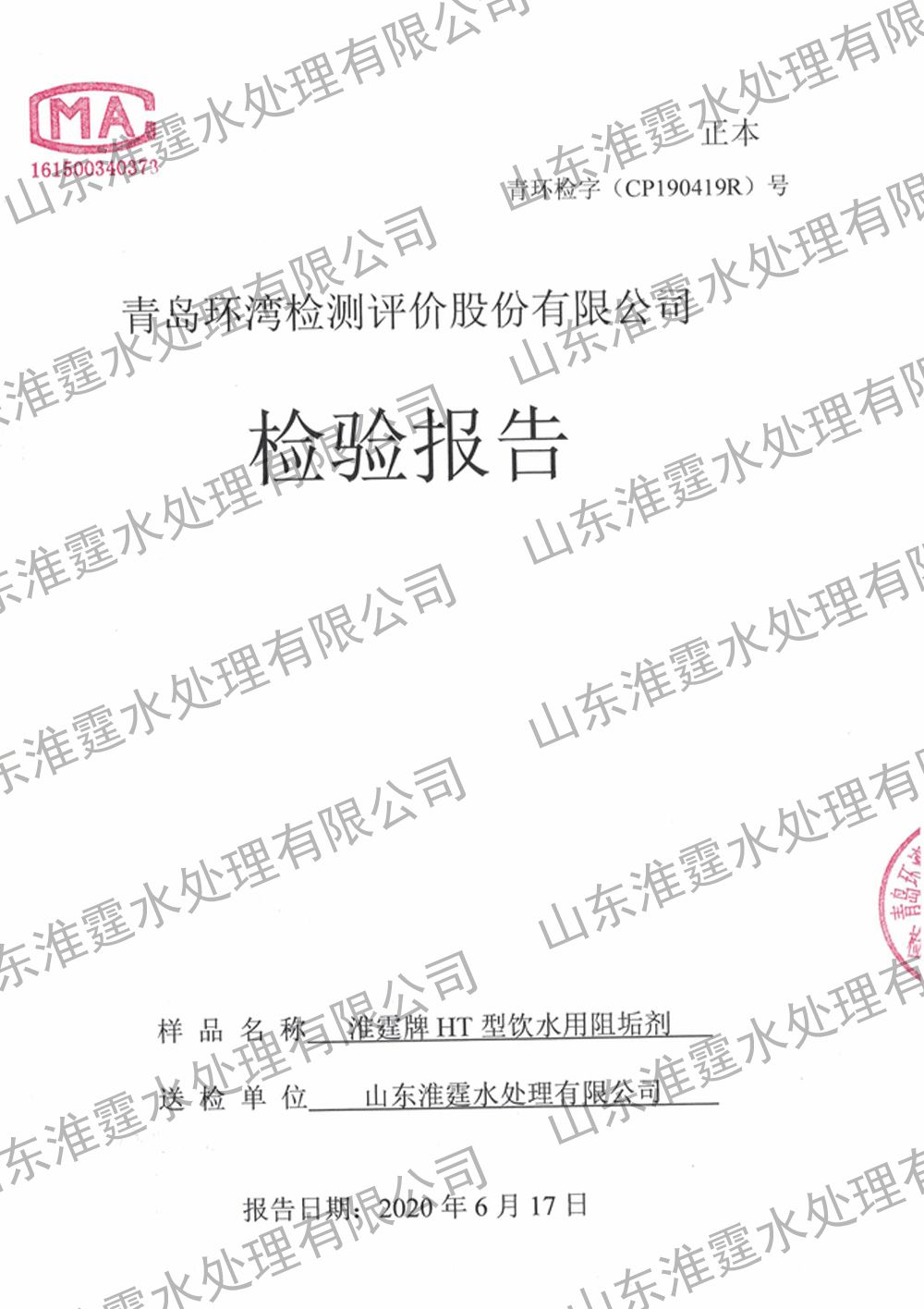 第三方检测报告(青岛环湾) - 荣誉资质 - 反渗透膜阻垢剂_缓蚀阻垢剂_杀菌灭藻剂_粘泥剥离剂_山东PA视讯水处理有限公司