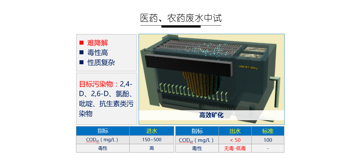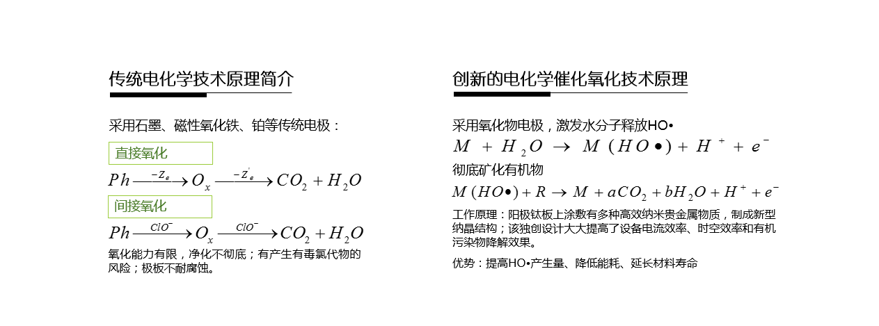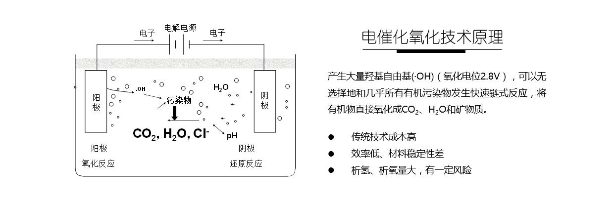 (1)改进传统电极表面:多孔、寿命长、效率高、电极无钝化(2)适用水质广:氨氮去除、脱毒效率高(3)无二次污染(4)设备维护方便、自动化程度高(5)无基建、占地面积少(6)无须添加化学药剂,无污泥产生